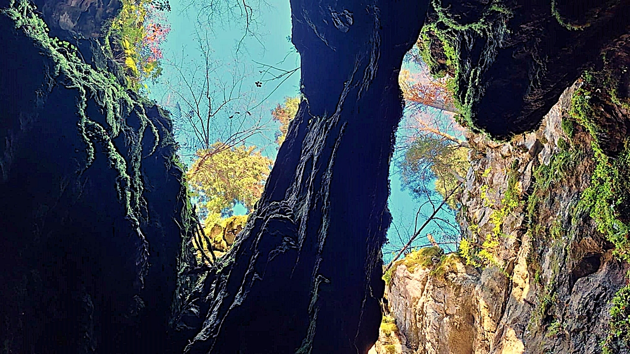 | Ez a barlang egy sajátos rombarlang, látványos beszakadása egy vékony kőpengét hozott létre. |